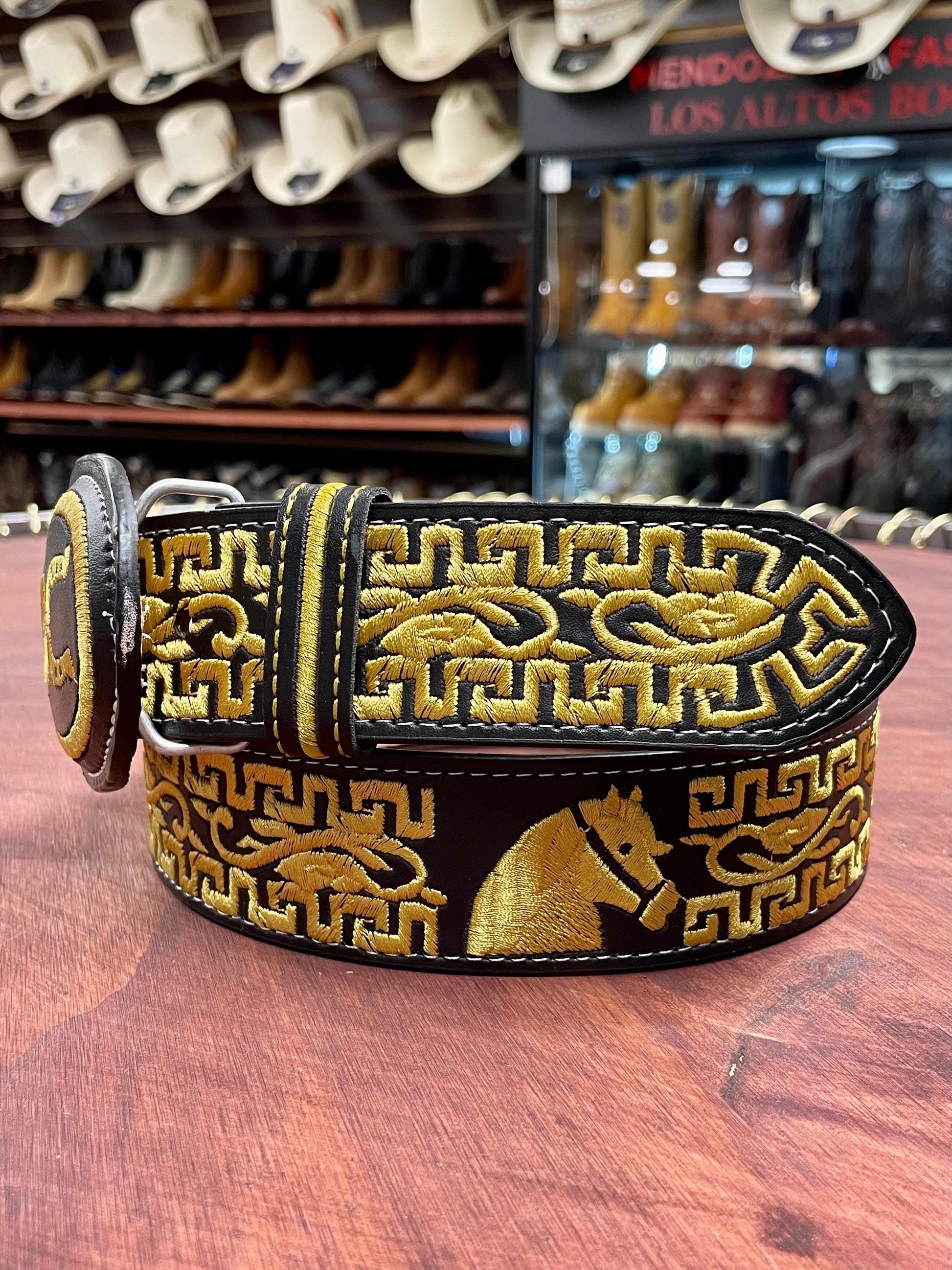 Yellow Embroidered Double Horse Shoe Black Belt