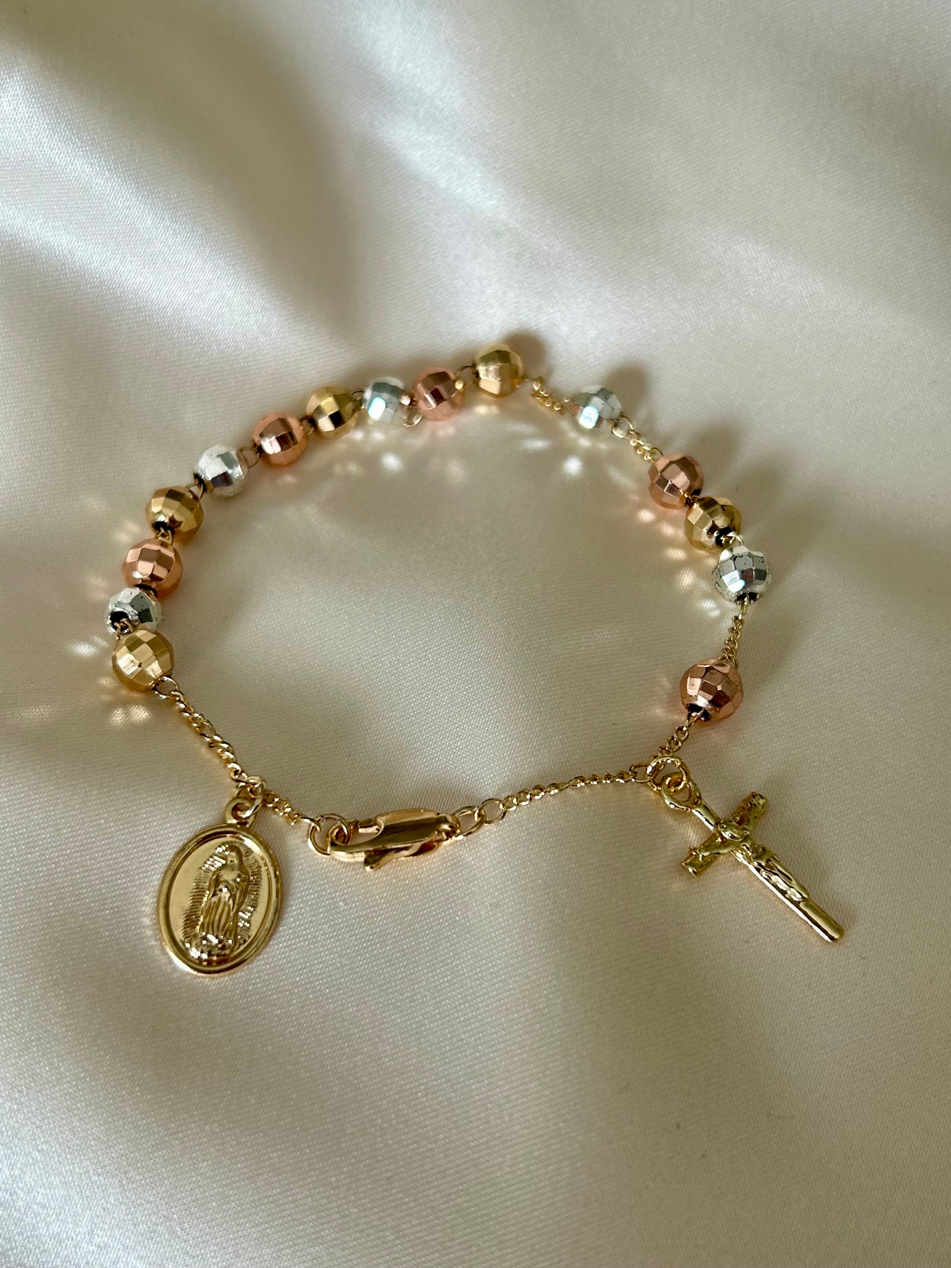 Three Toned Rosary Bracelet with Cross & Mother Mary Charms